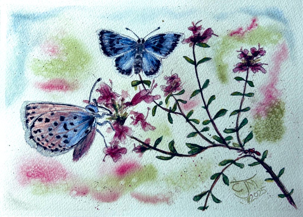 An original watercolour painting of Large Blue Butterflies on Thyme.