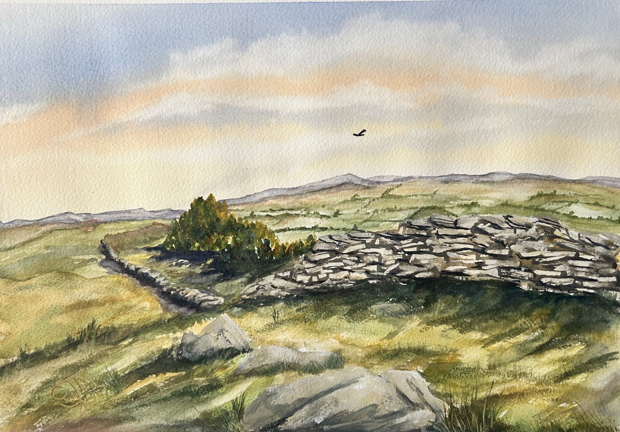 A watercolour painting of the iconic Hadrian’s Wall near Walltown Country Park after a painting by Charles Evans.