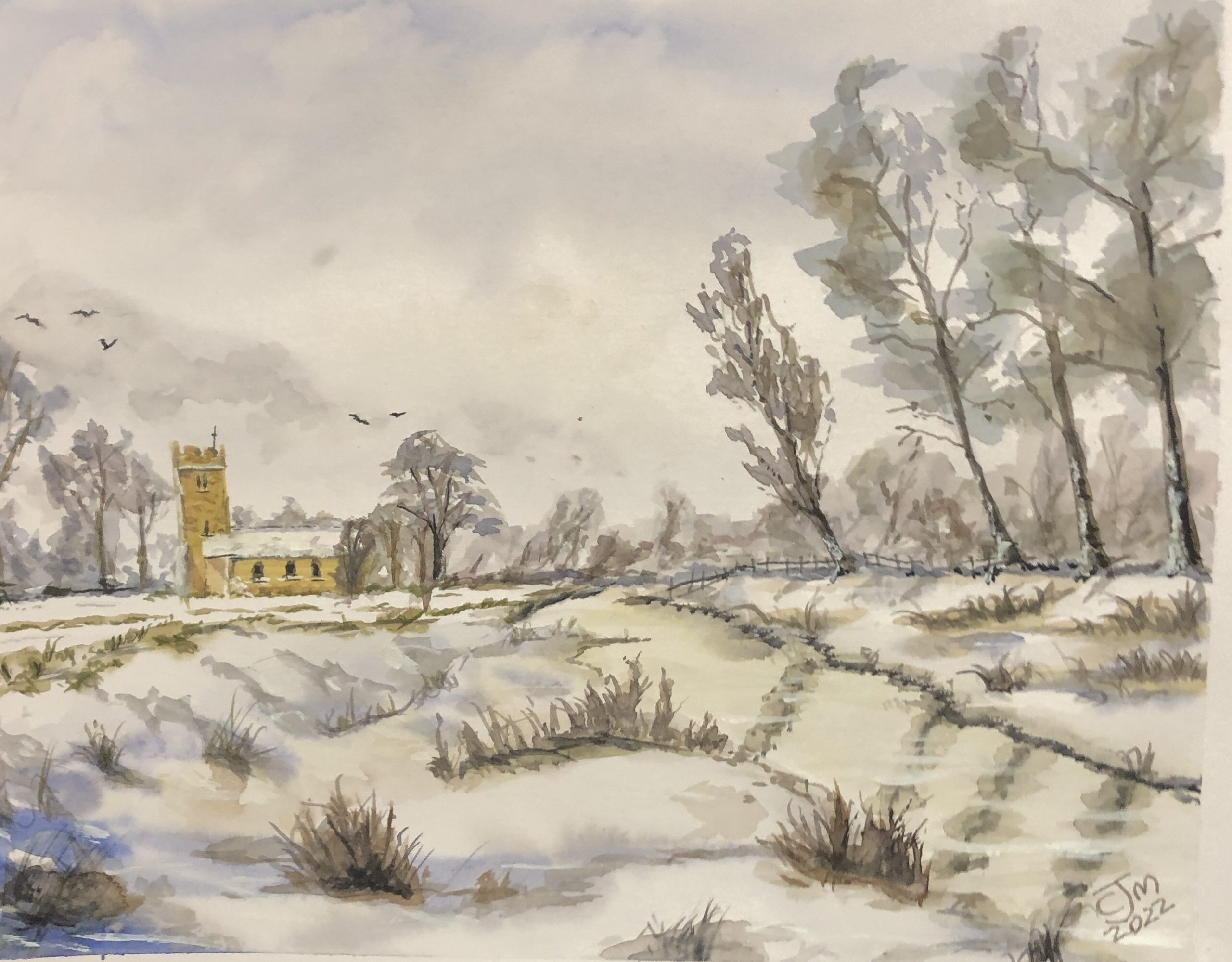An original watercolour painting of Wickhambreaux Church Kent in the snow inspired by a painting by Adrian Leppenwell.